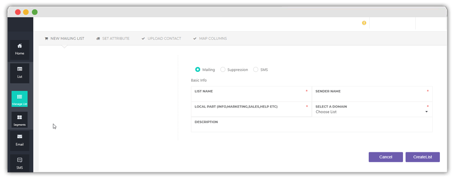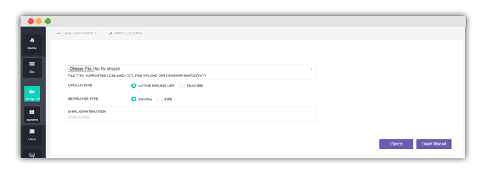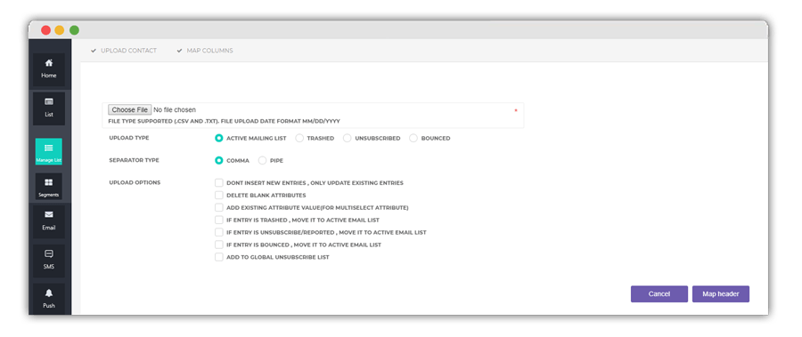 رفع القائمة: لتحميل قائمة لقائمة بريدية، تأكد من وجود عناوين البريد الإلكتروني تحت عنوان “البريد الإلكتروني”، يمكنك تحميل تفاصيل أخرى مثل الاسم الأول، اسم العائلة، ورقم الهاتف المحمول، الخ إلى جانب عنوان البريد الإلكتروني