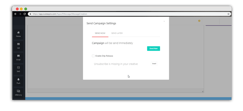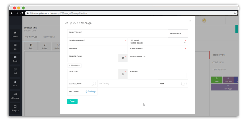 بمجرد الانتهاء من إضافة المحتوى، تأكد من إضافة “رابط إلغاء الاشتراك باستخدام خيار “متقدم”، كما يمكنك أيضا تخصيص البريد من خلال إضافة سمات له (التي تم تحميلها إلى جانب مُعرِّفات البريد الإلكتروني) من قائمة “تخصيص”