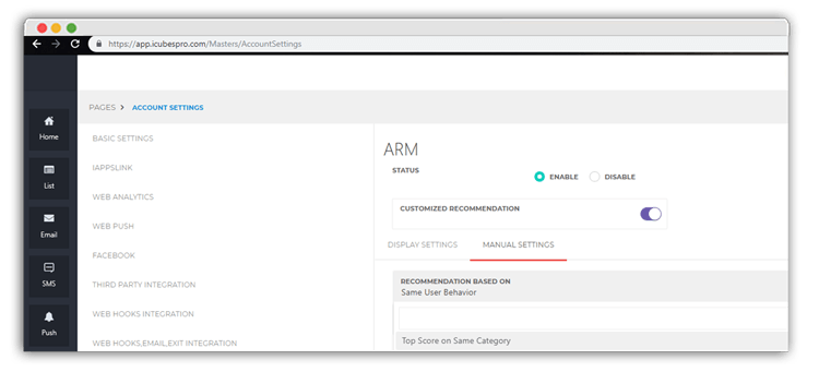 • ضبط إعدادات وحدة التوصية المتقدمة، بمجرد دمج وحدة التحليلات في موقع الويب الخاص بك وتحميل المعلومات الخاصة بالمنتج في حسابك، ستتبقى خطوة واحدة قبل التمكن من إرسال حملات التوصية المتقدمة وهي ضبط إعداداتها في قائمة “إعداد الحساب”