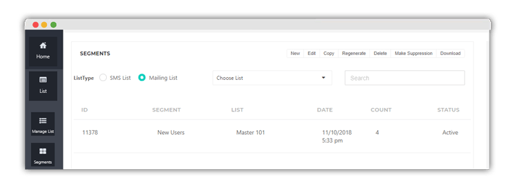 يمكن إنشاء قسم (شريحة مستهدفة) بالنقر فوق اختيار “جديد” تحت علامة تبويب المقاطع ضمن القائمة